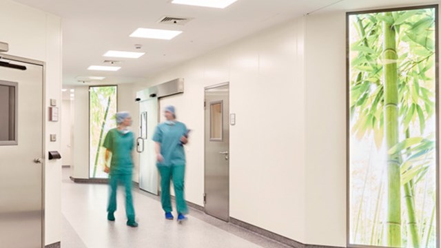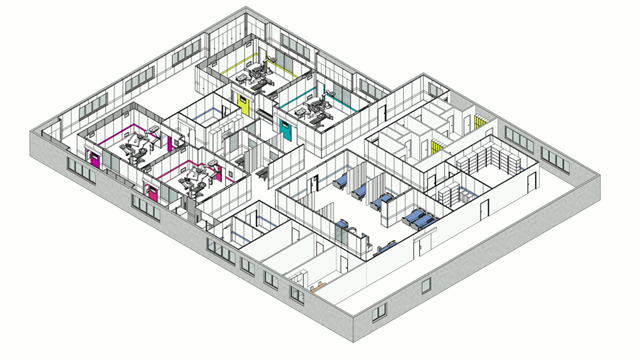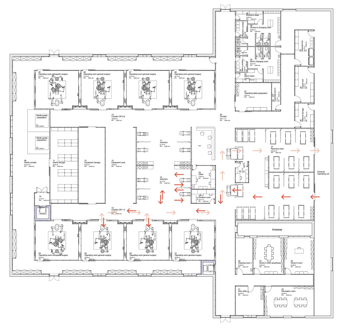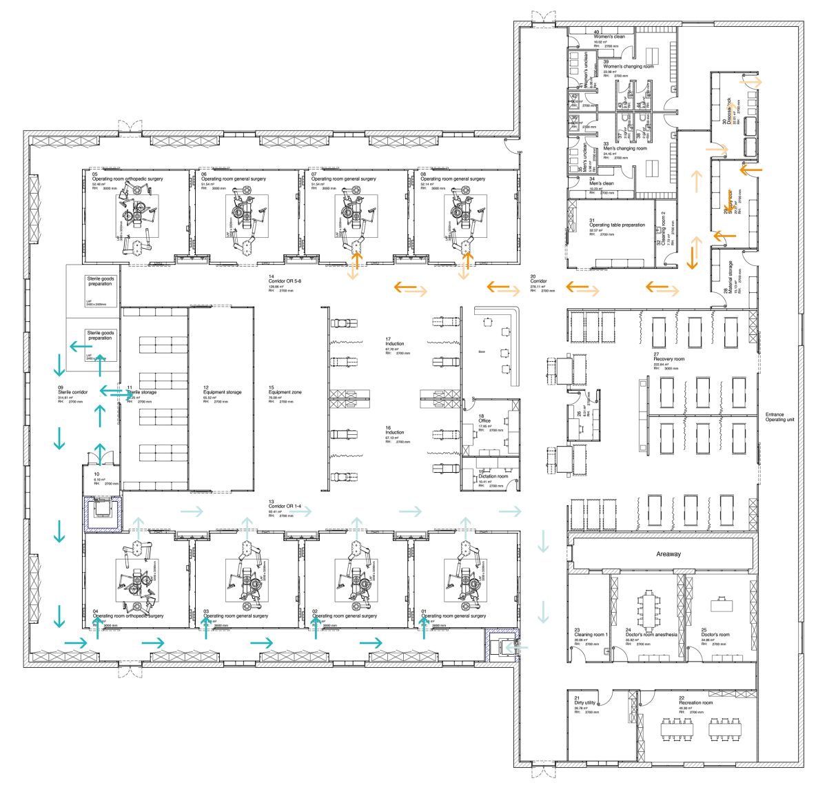 Grundrisse und Arbeitsabläufe für OP-Abteilungen mit 17 OP-Sälen.