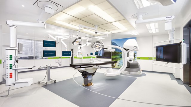 Ein operativer Arbeitsbereich, der bildgebende Ausstattung mit einem multifunktionalen Operationstisch kombiniert.